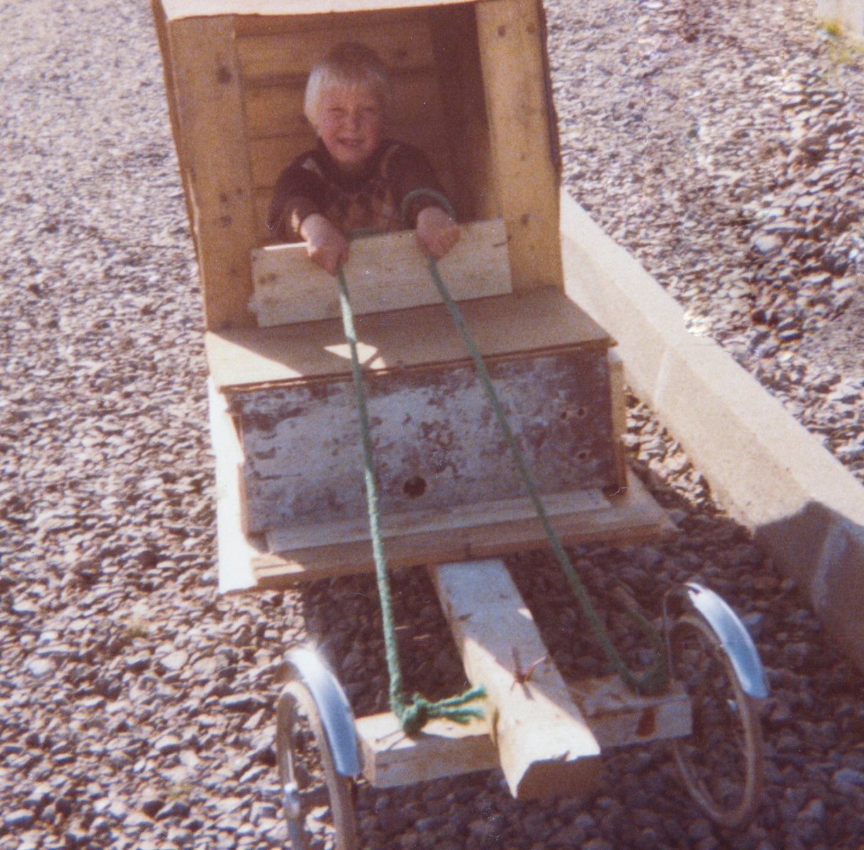 Kassebilkjøring var gøy, selv om vi ikke hadde så mye hestekrefter. Her gikk det i ungdommelig skyvekraft og heldigvis lav fart. Foto: 1981.