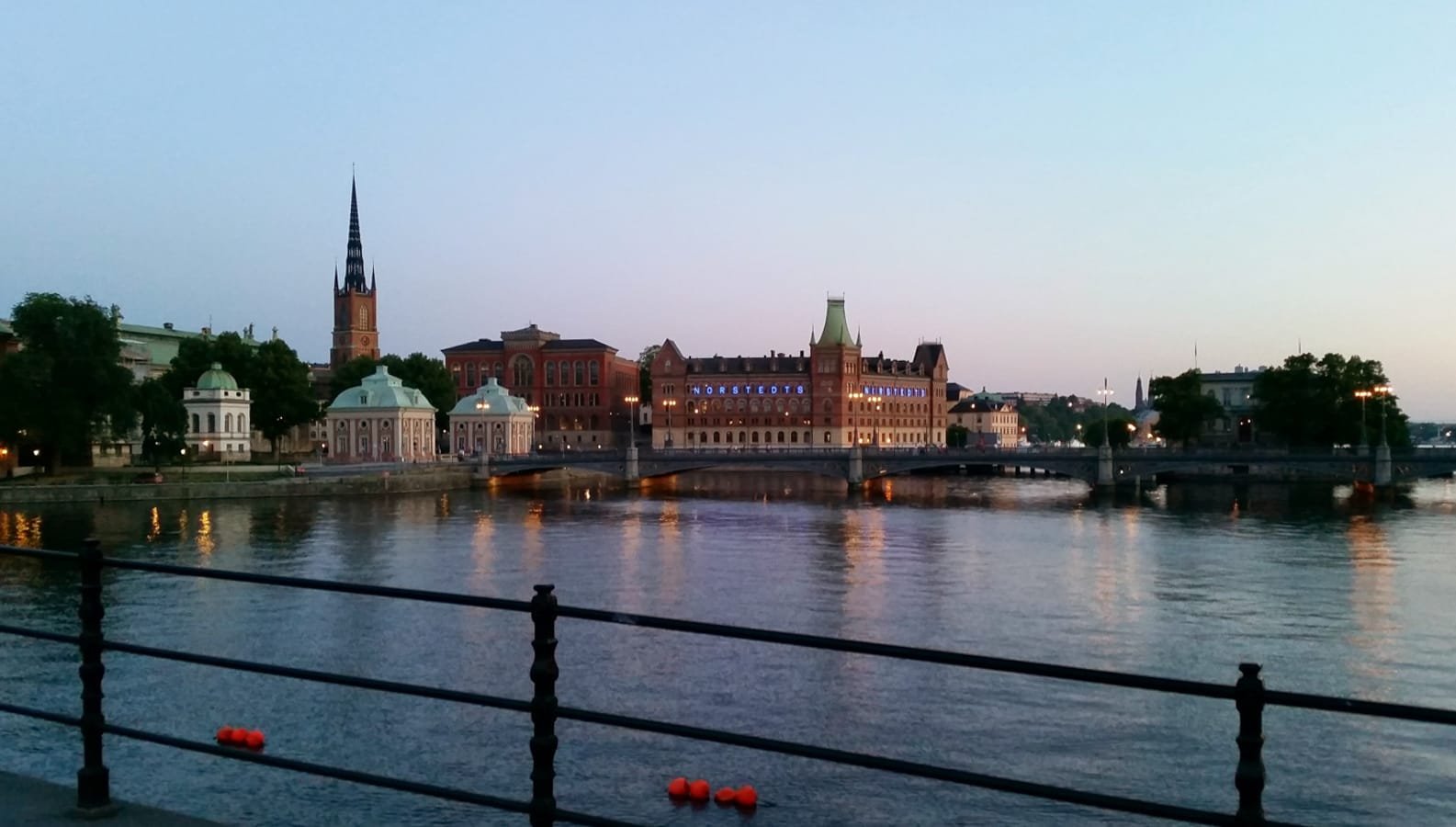 Solrik sommerdag i Stockholm, med båter og byens sjarmerende hoteller i bakgrunnen.