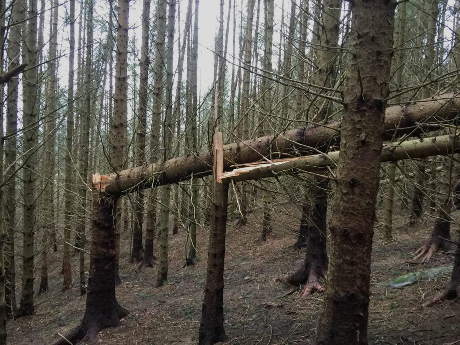 Knekte trær i skogen ved Nøttveitveten