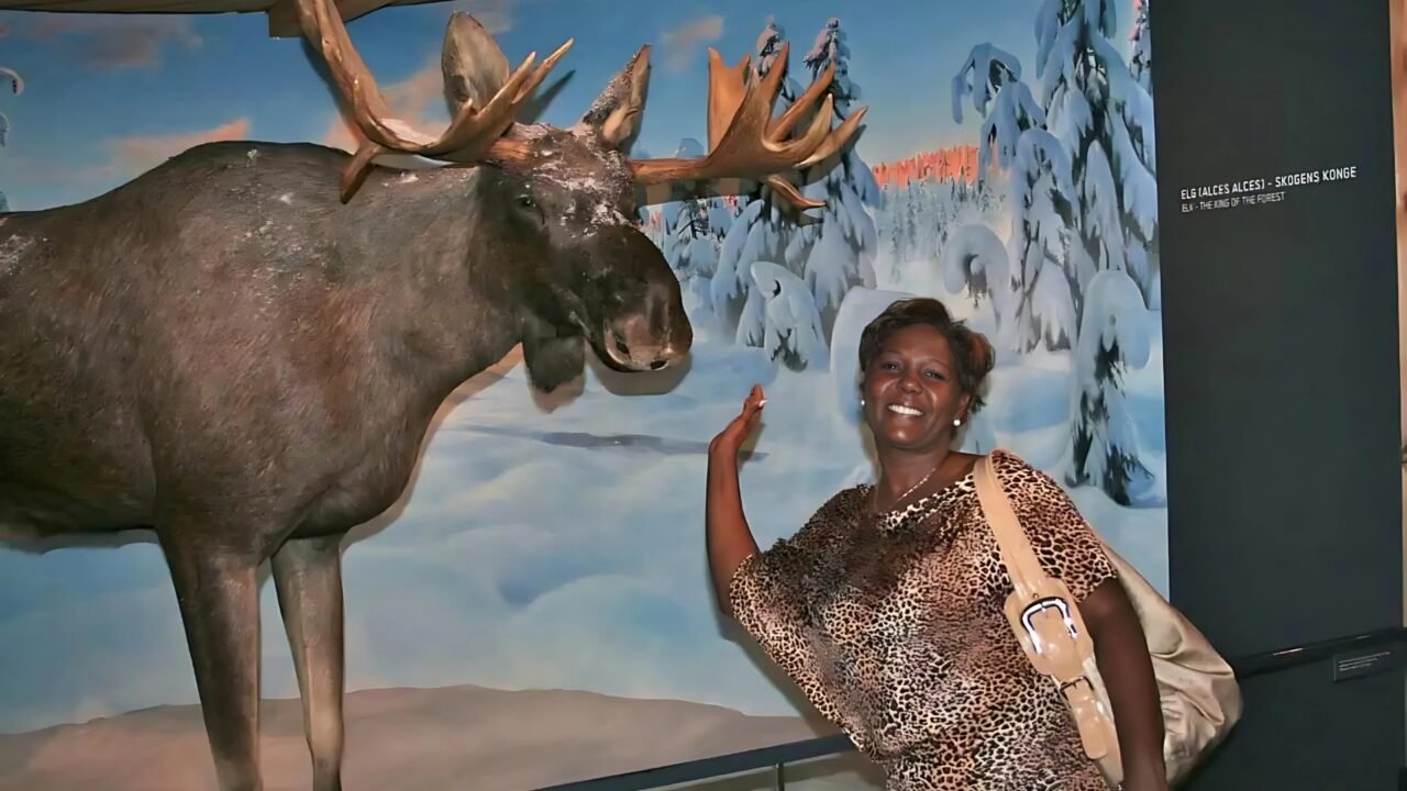 Belkis på skimuseet ved Holmenkollen, elgen var heldigvis ikke levende. Foto: 26.07.2011 av Tormod Gundersen.