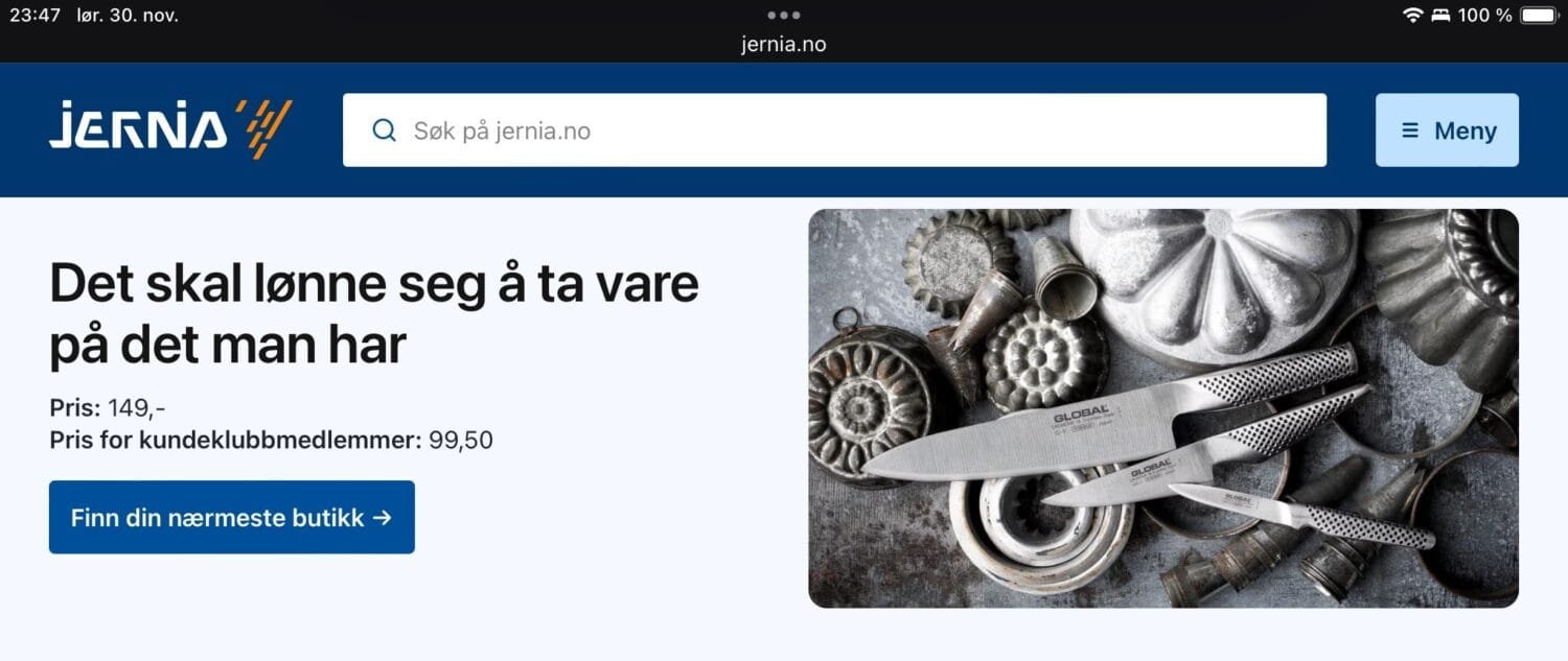 - Pris: Knivsliping hos Jernia starter fra 99,50 kr for medlemmer og 149 kr for øvrige.