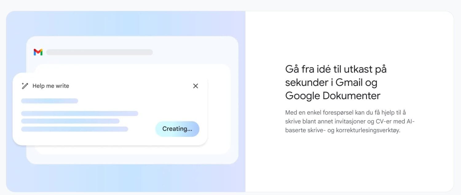 – ✍️ Automatisere skrivearbeid i Google Docs – med AI-assistenten «Help me write» som kan generere, omformulere eller forbedre tekst.