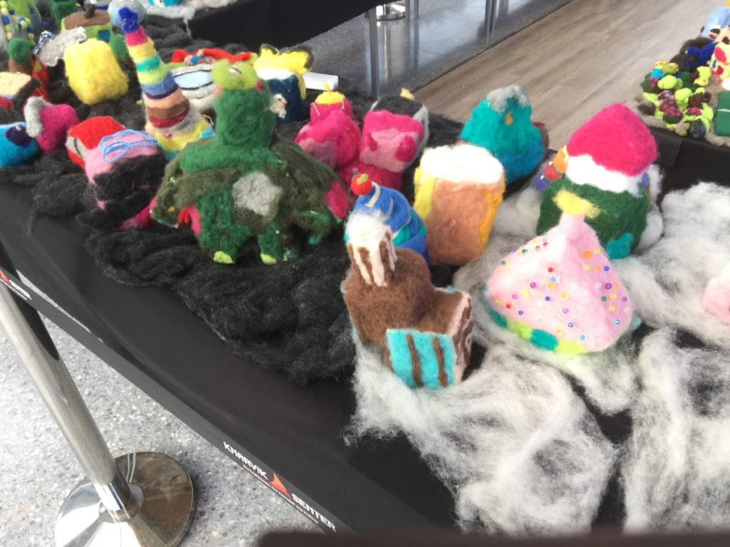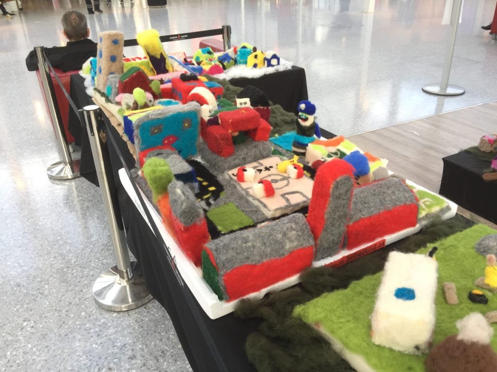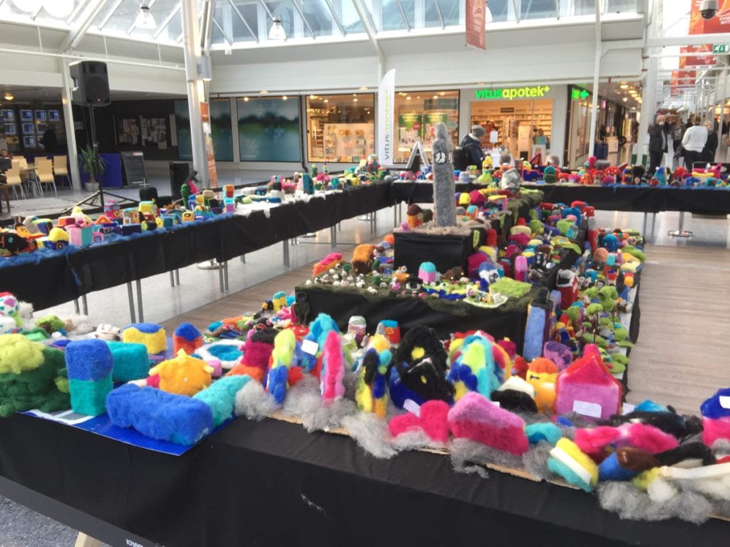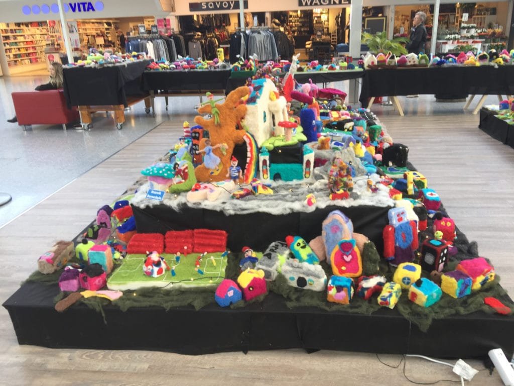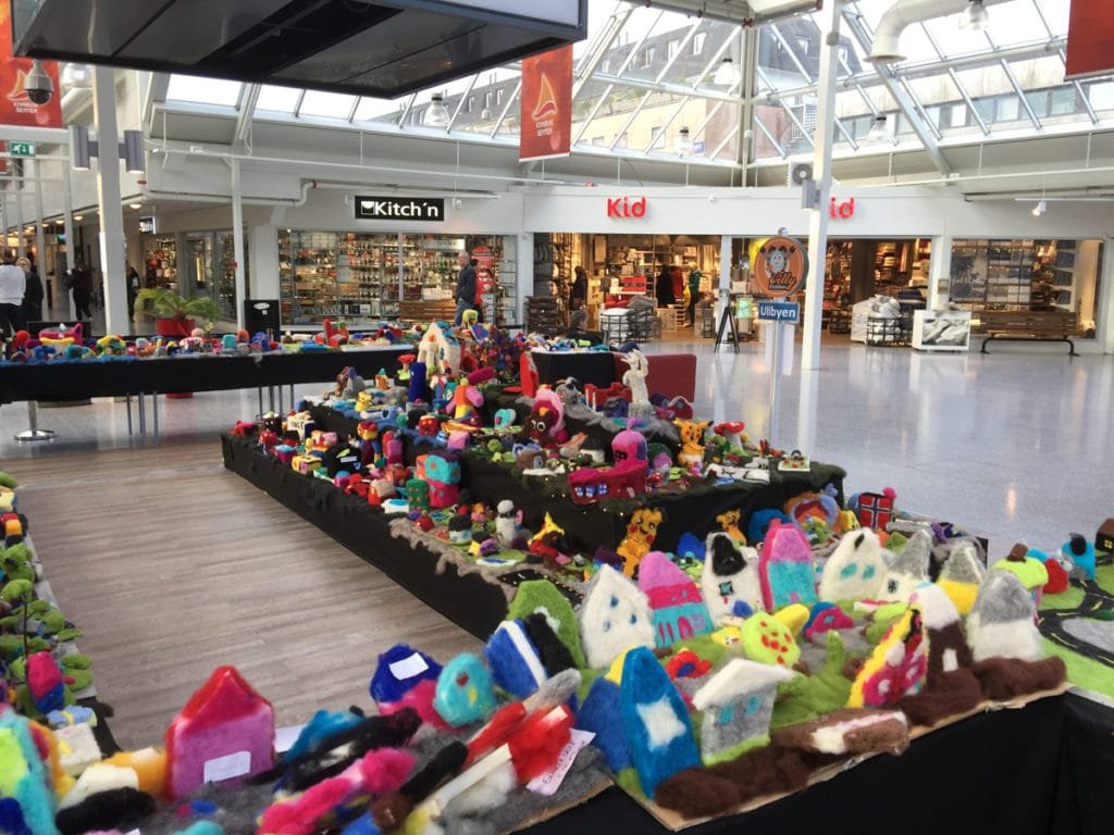 Jeg var innom Knarvik Senter 3. november 2016 og ble møtt av en flott utstilling som heter Ullbyen. Utstillingen er laget i kardet ull og nålefiltet av elever fra skoler i Norhordland og Åsane i Ullveka`16 fra 21-30. oktober.