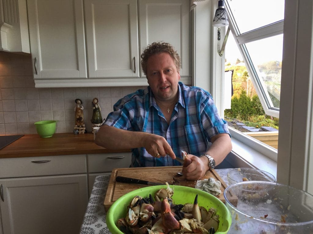 Min far har krabbekoker slik at vi kan koke den ute, dermed unngår man den sterke krabbelukten inni huset. Vi var selvsagt med og hjelpe til med koking og ikke minst rensking.