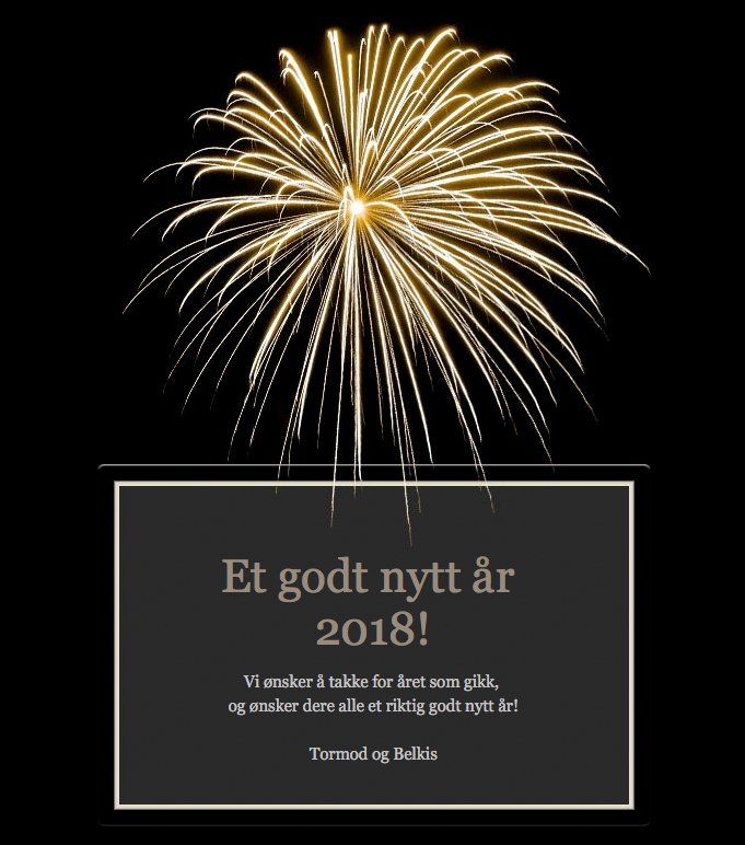 I dag er det nyttårsaften 2017. Vi vil takke for det gamle, og ønske alle våre venner og familie et godt nytt år 2018.