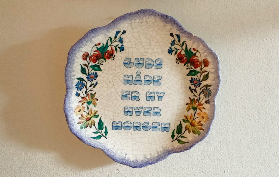 Nydelig porselenfat med innskrift «Guds nåde er ny hver morgen.»Foto: Tormod Gundersen.