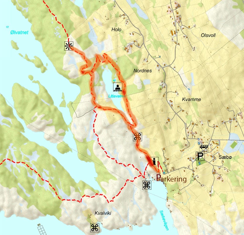 Start på turen starter ved veien hvor det er plassert en benk og en informasjonstavle med kart.