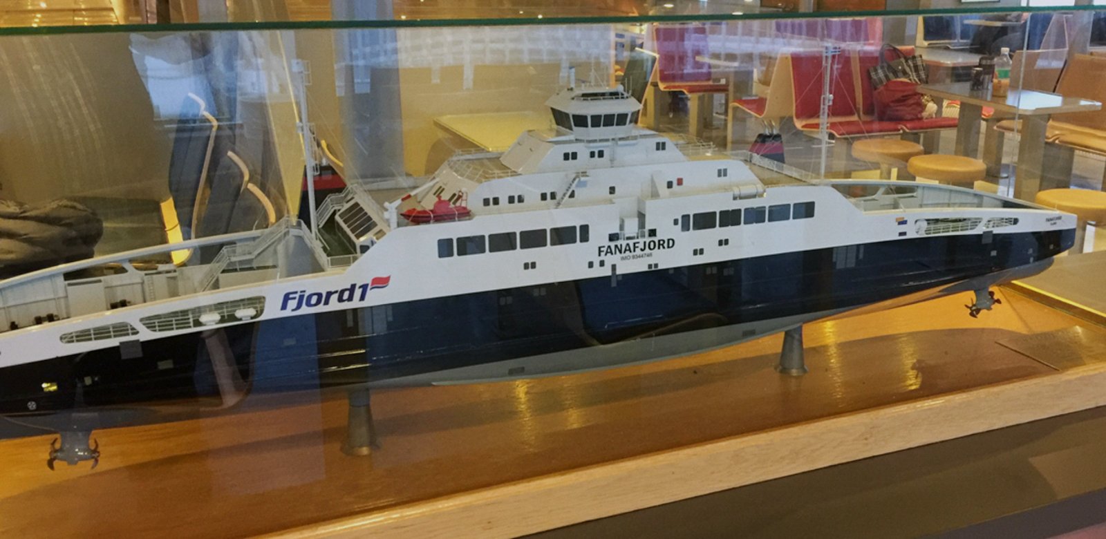 MS Fanafjord i miniatyr er utstilt i et beskyttende glassbur ombord. Foto: 30.12.2016 Tormod Gundersen.