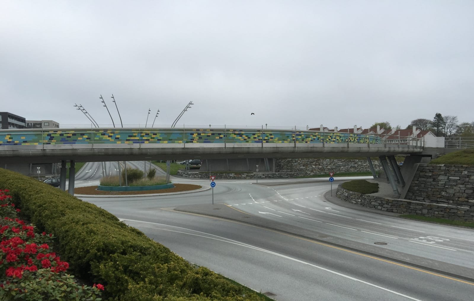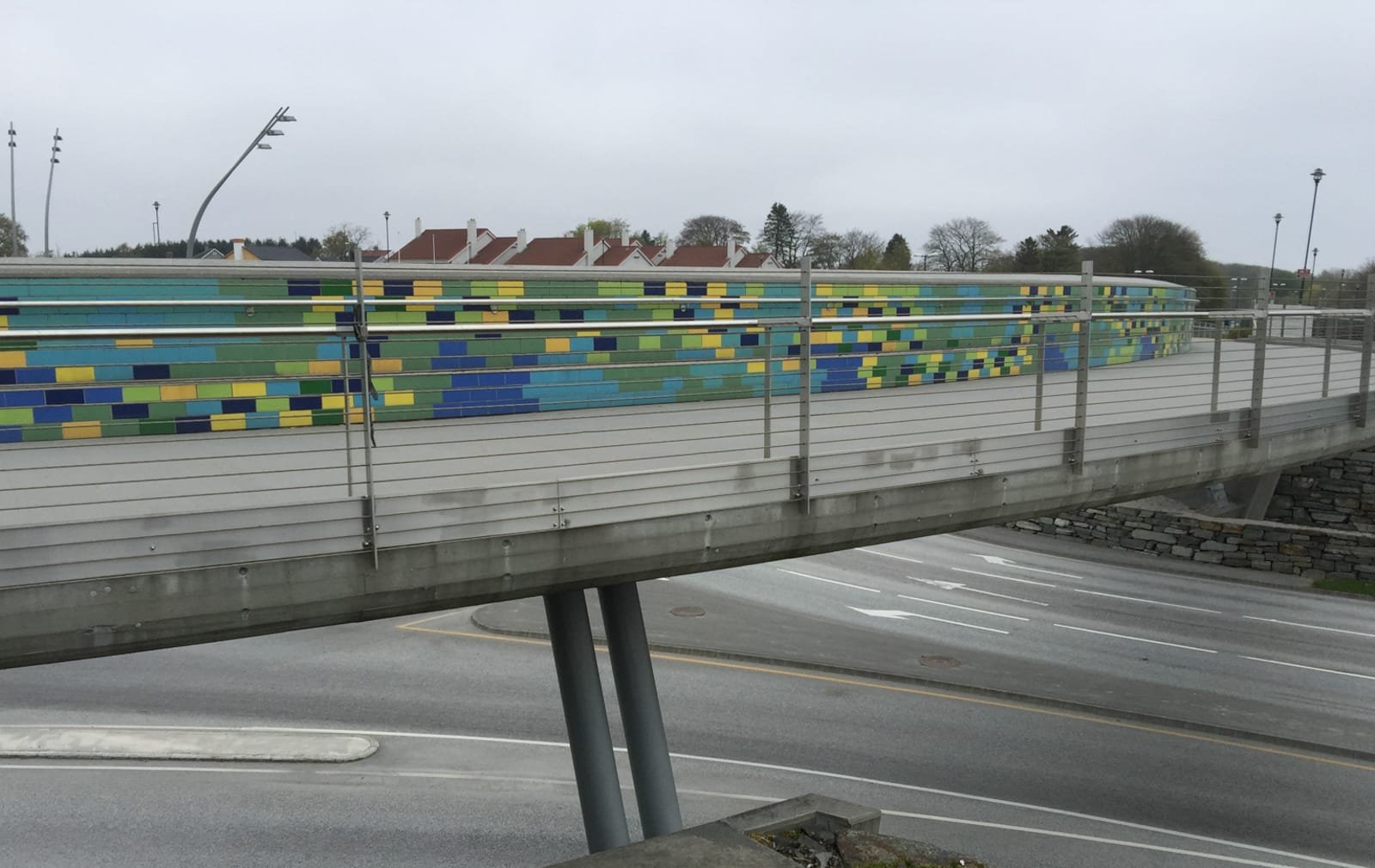 Gangveisystem med ringbro over rundkjøringen er dekorert med fargerike fliser. Foto: Tormod Gundersen.