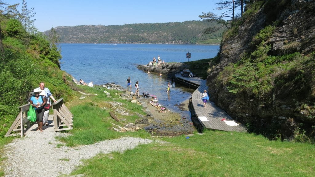 Da vi vokste opp gikk det en tursti ned til viken, men nå er det bygd flott grusvei helt fra parkeringsplassen ved fotballbanen og ned. Man går ned til badeviken på ca. 5 minutter.