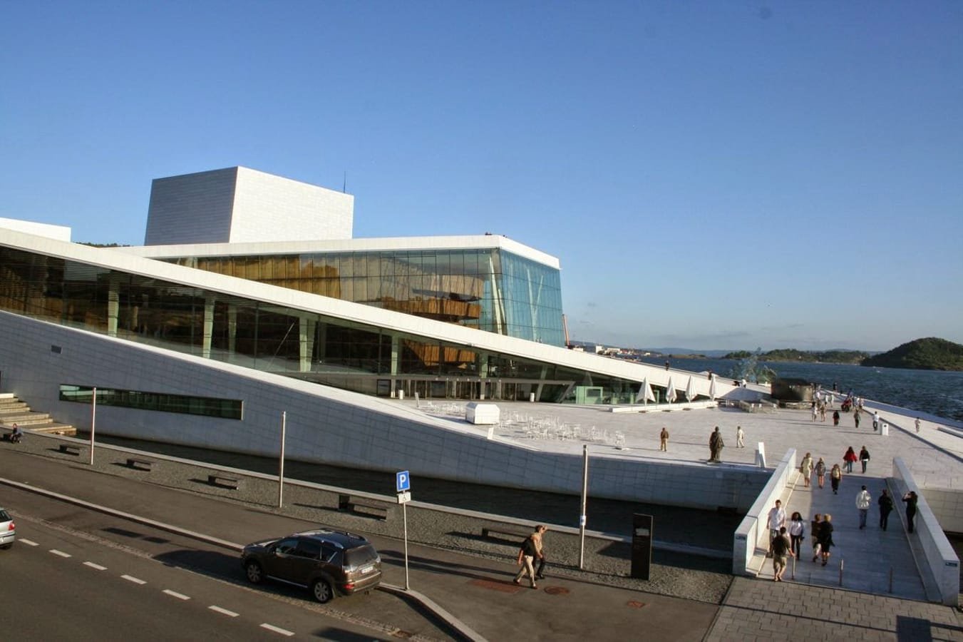 Operahuset i Oslo ligger i Bjørvika innerst i Oslofjorden, og er bygget slik at man kan gå oppover bygningen på begge ...