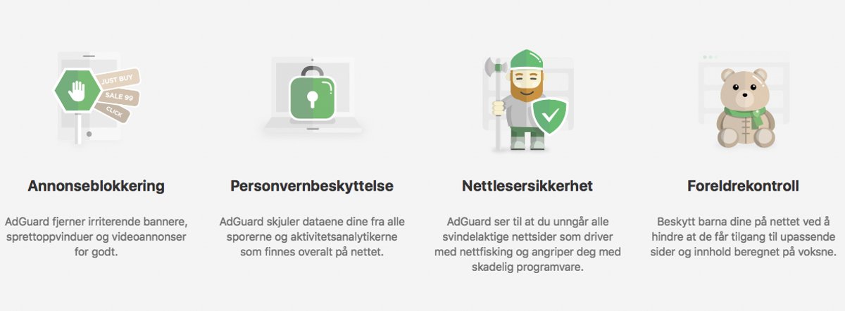 Annonseblokkering, personvernbeskyttelse, nettlesersikkerhet og foreldrekontroll. Foto skjermbilde Adguard.com.
