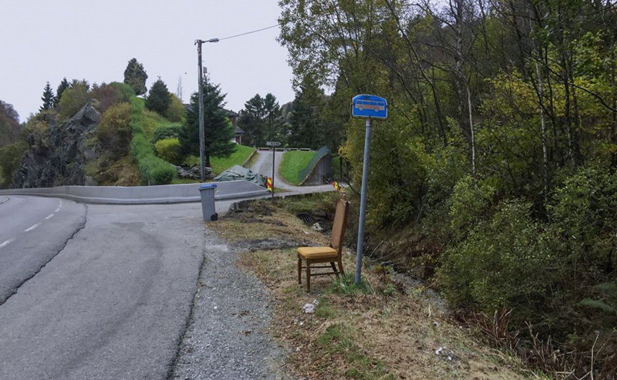 For en tid tilbake var jeg ute og gikk tur langs Salhusvegen utenfor Bergen. Da kom jeg til denne bussholdeplassen hvor noen hadde satt ut en stol. Jeg tenkte; når ikke kommunen har råd til busskur, ja da må man improvisere og finne alternative løsninger. Jeg syntes det var litt morsomt  og kreaktivt og tok selvsagt et bilde.