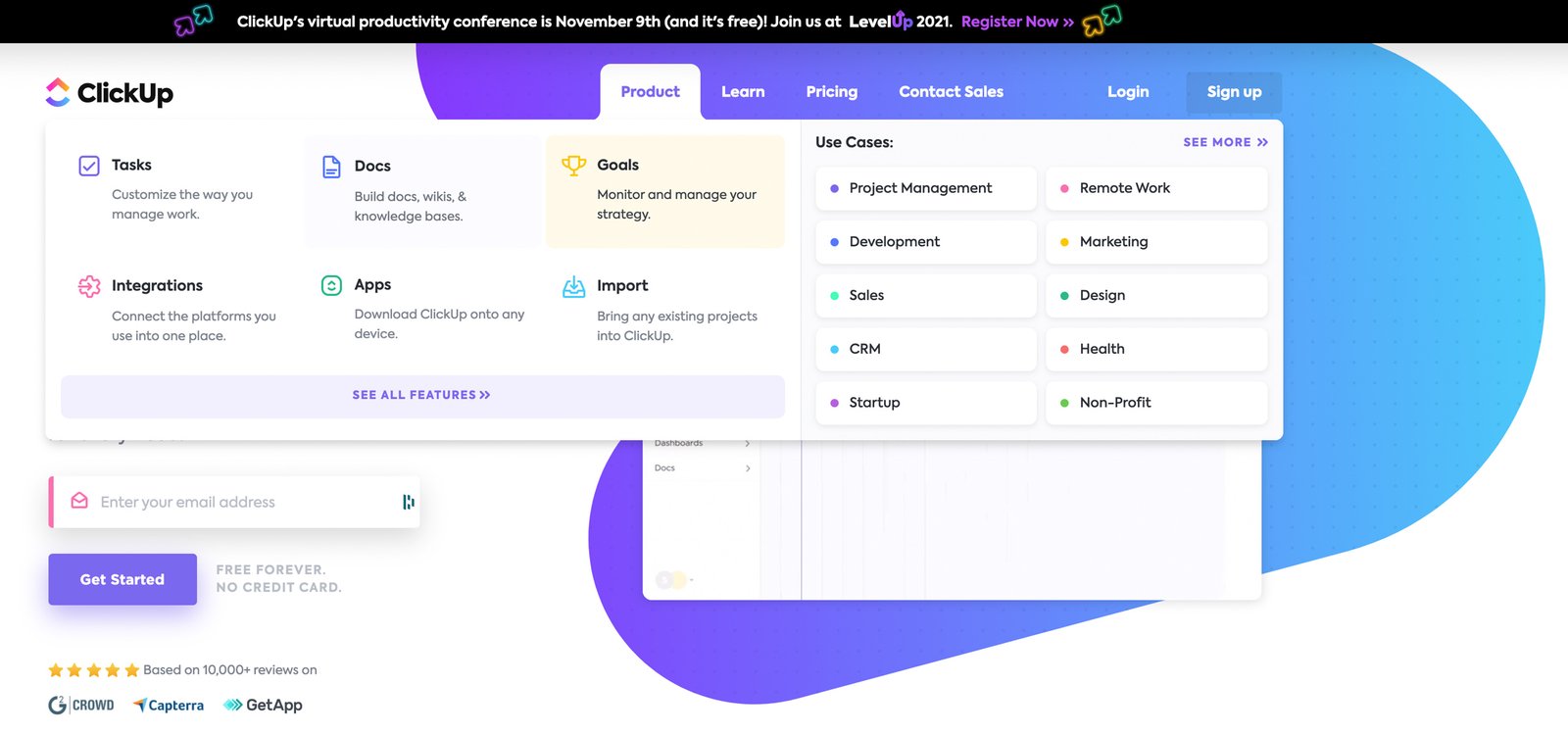 ClickUp er en av de topprangerte produktivitetsplattformene for enhver bedrift eller frilansjobb. Store bedrifter som Google, Booking.com, San Diego Padres og Uber bruker ClickUp for å øke produktivitet på arbeidsplassen.