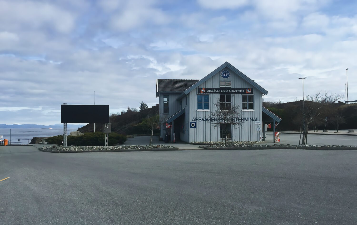 På Arsvågen fergekai er det toaletter, kafeteria hvor man kan sitt inne eller ute på fine dager. Foto: 23. mars 2017 av Tormod Gundersen.