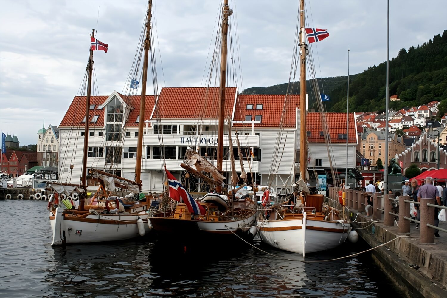 Innerst i vågen i Bergen ligger seilbåtene side om side. Foto: Tormod Gundersen juli 2006.