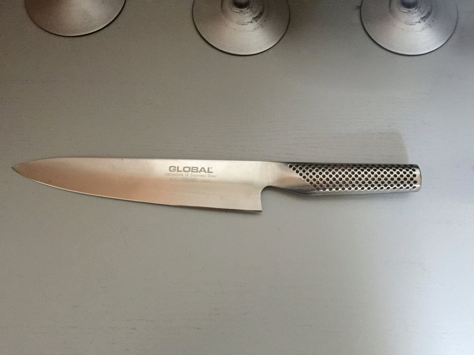 Global kokkeniv G-2, 20 cm har blitt en populær kniv med stålhåndtak. Foto: Tormod Gundersen.
