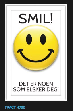 Der finnes mange ulike hefer og traktater om evaneliet om Jesus Kristus. Noen koster vanligvis litt penger, men ønsker du ett gratis alternativ så kan jeg anbefale World Missonary Press. Dessverre er utvalget på norsk begrenset, men de har traktaten «Smile.»