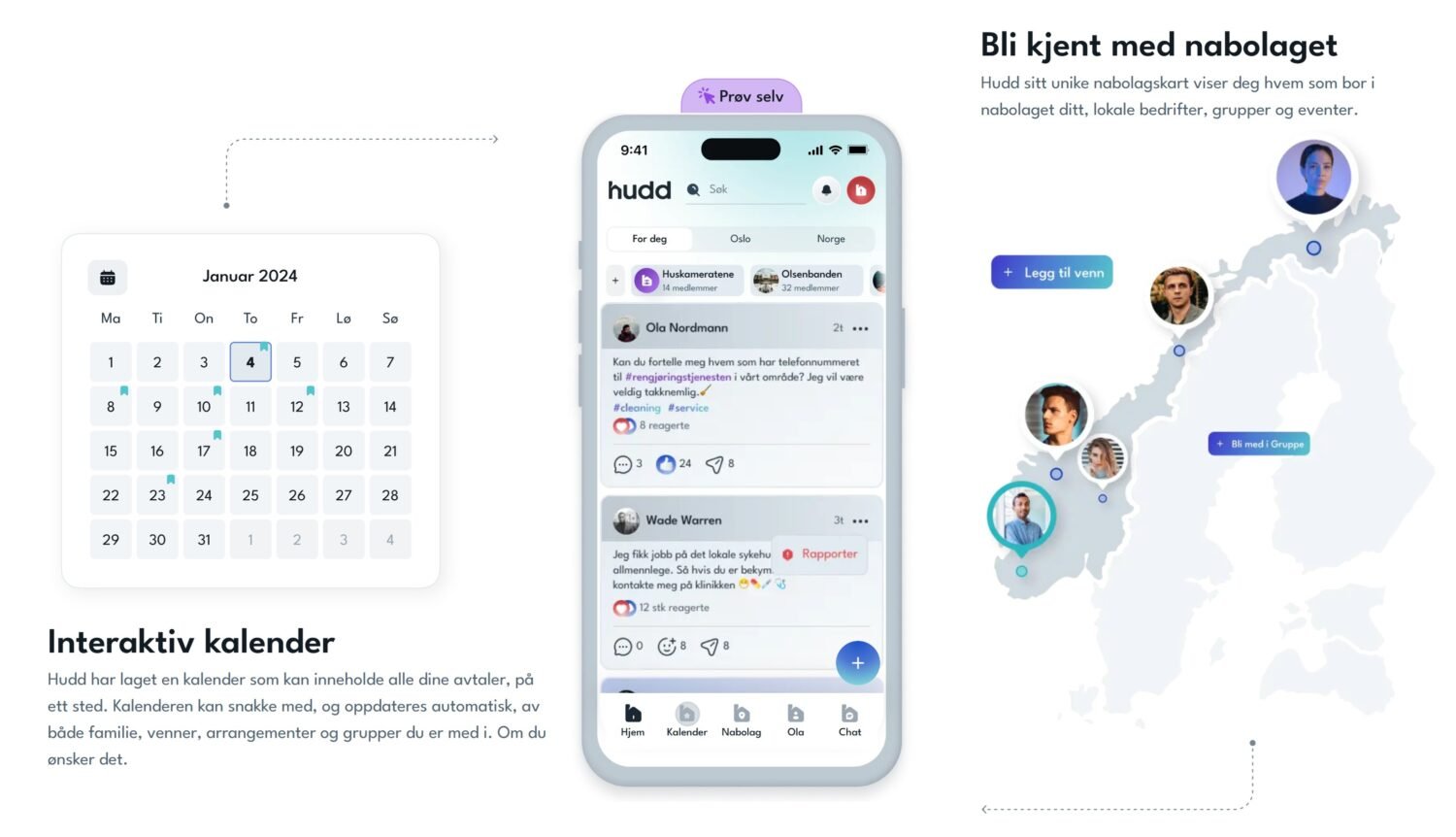 Hudd er en norskutviklet sosial plattform designet for å fremme ekte forbindelser mellom mennesker i deres nærmiljø. Alle brukere verifiseres gjennom Vipps og må bruke sine ekte navn, noe som sikrer at du kun samhandler med virkelige personer. Plattformen er fri for manipulerende algoritmer og støyende reklame, og presenterer innhold i en kronologisk nyhetsstrøm.