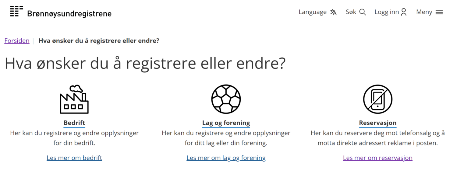 Velg reservasjon på Brønnøysundregistrene! Bilde skjermdump brreg.no.
