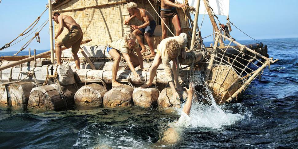 Kon-Tiki flåten til Thor Heyerdahl (1914-2002) skulle bevise at Polynesia kunne ha blitt befolket fra Sør-Amerika. Foto: Filmweb.no.