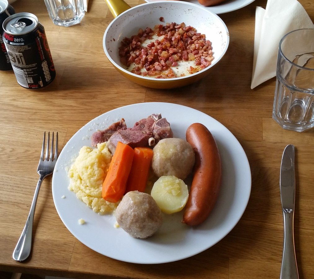 Noen liker å ha en kokt potet ved siden av raspeballen. Det er ikke et must for meg, da tar jeg heller en ekstra raspeball! Gulrot går til alt, og er godt selv om kålrot trolig er nok «grønt» til denne retten.