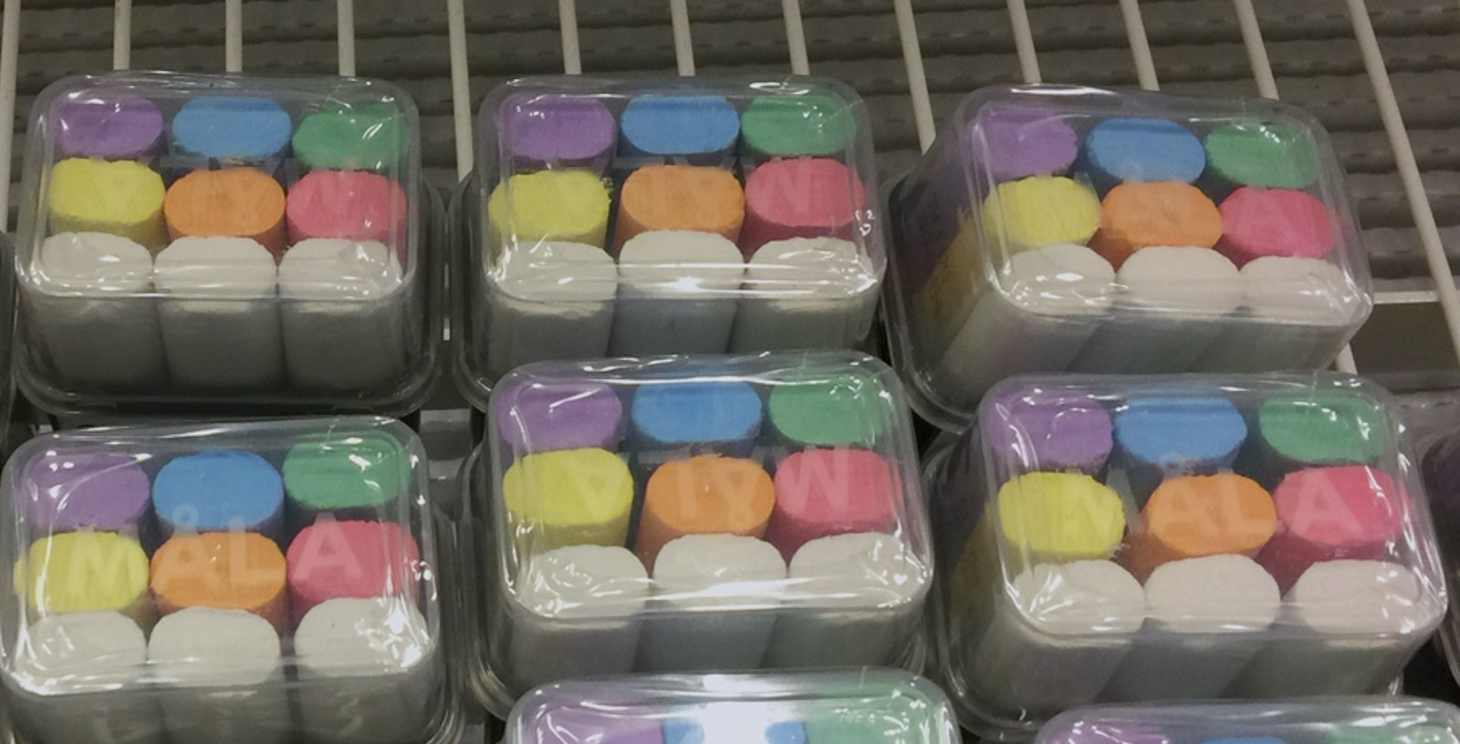 En boks med kritt i forskjellige farger slik at du kan krydre informasjonen på tavla. Foto: Tormod Gundersen.