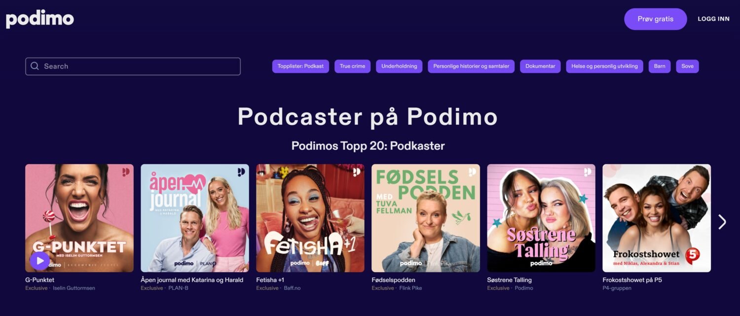 Podimo har et imponerende arkiv av podkaster i ulike sjangre. Her er noen eksempler: