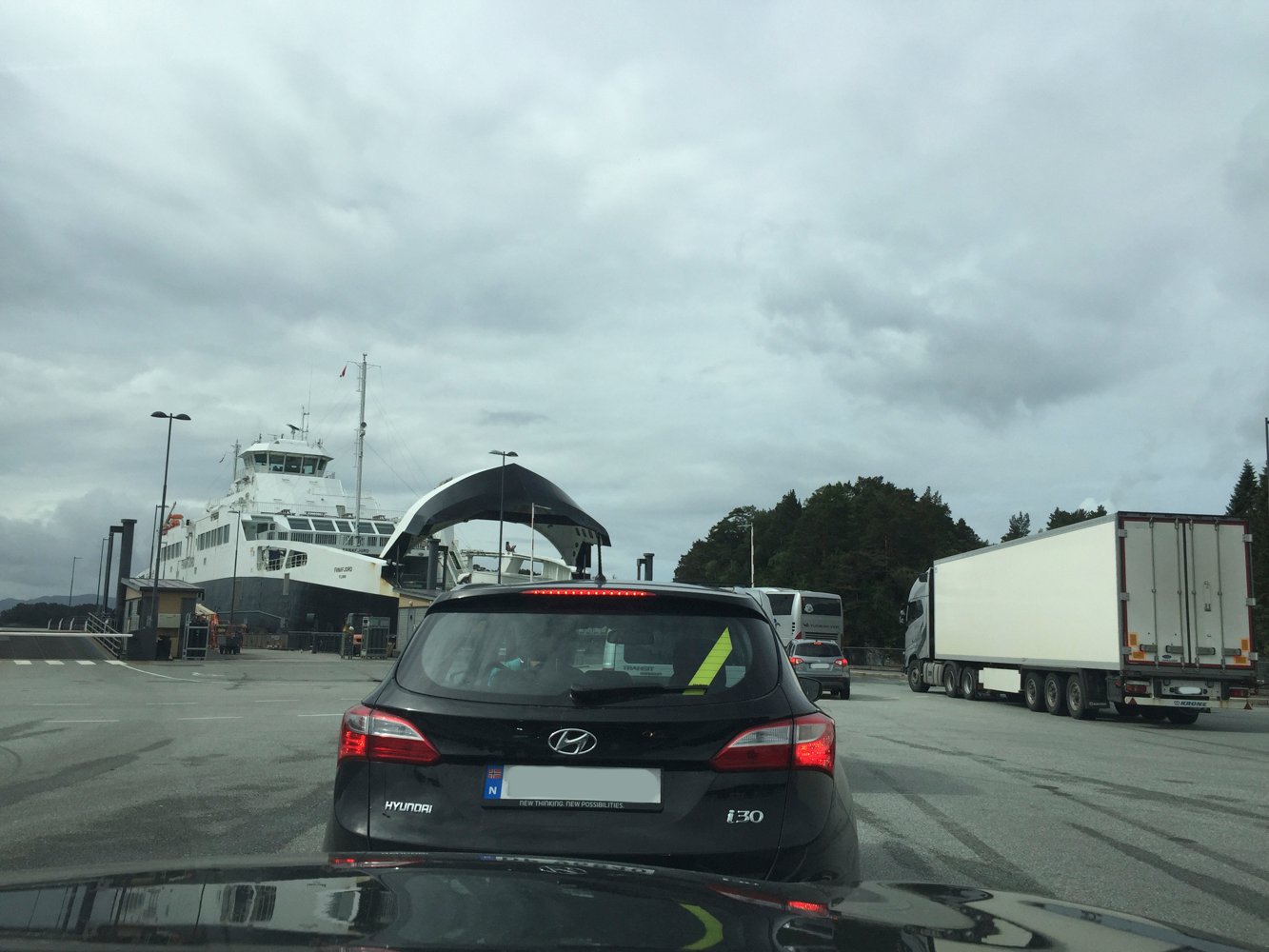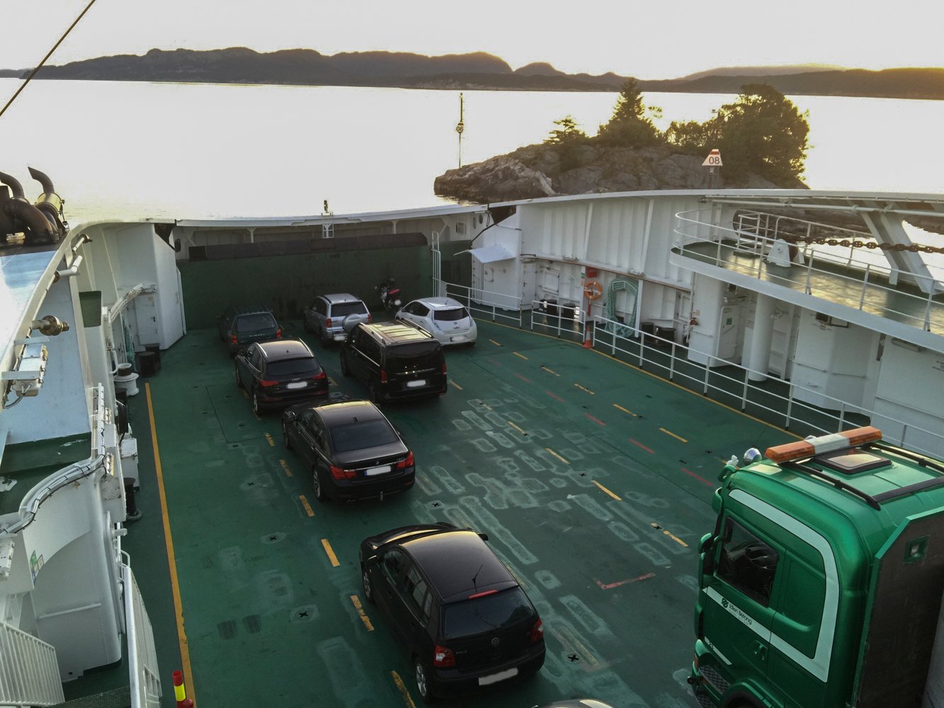 Utsikt over dekk på ferge fra Sandvikvåg til Halhjem. Foto: 19.08.2015 Tormod Gundersen.