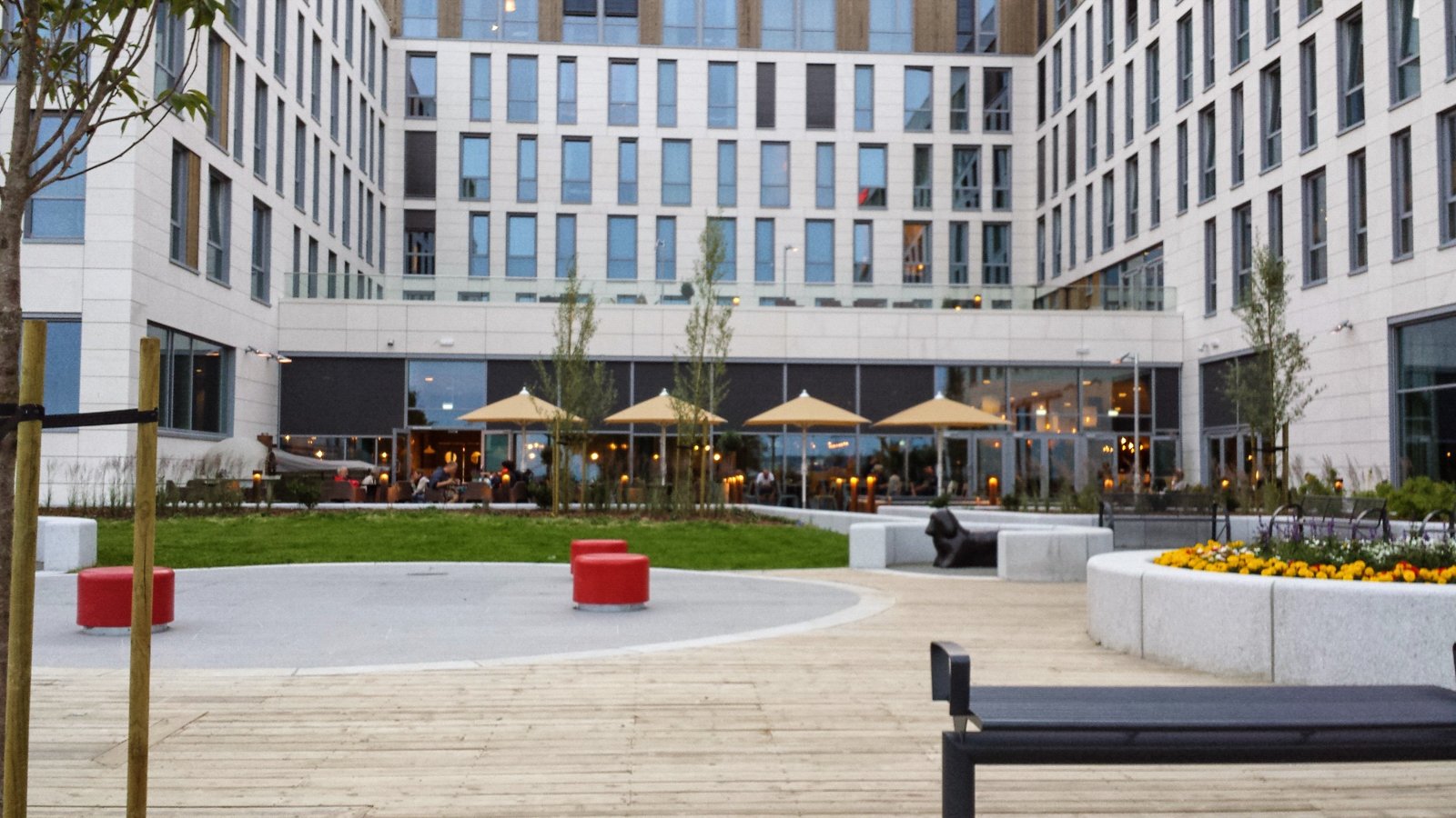 Uteområdet foran hotellet er lekkert designet med behagelig underlag, benker, blomstrer, men også praktisk tilrettelagt for uteservering og bespisning.