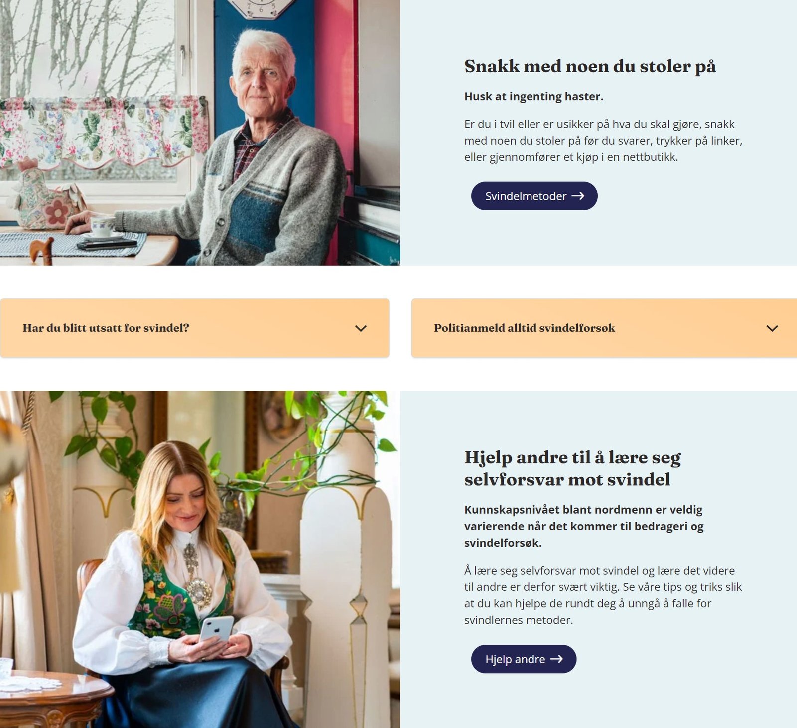 • Nettsiden forklarer vanlige svindelmetoder og gir tips til selvforsvar.