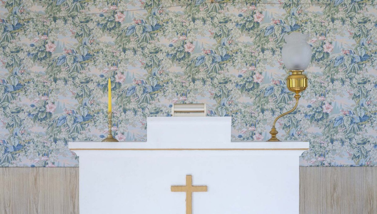 Mølstre bedehus ble tapetsert under en oppussing på 50-tallet. Dette bilde ble valgt som omslag på billedboken. Foto: Erlend Berge / Bedehusland.no.