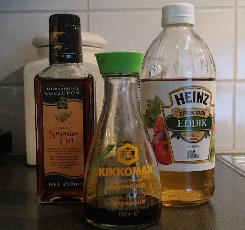 Bland alt godt sammen og smak deg frem. Den skal ha syre og friskhet av eddiken. Husk man kan alltid tilsette mer syre enn motsatt. Forsiktig med sesam oljen, for mye av den vil ikke være godt.