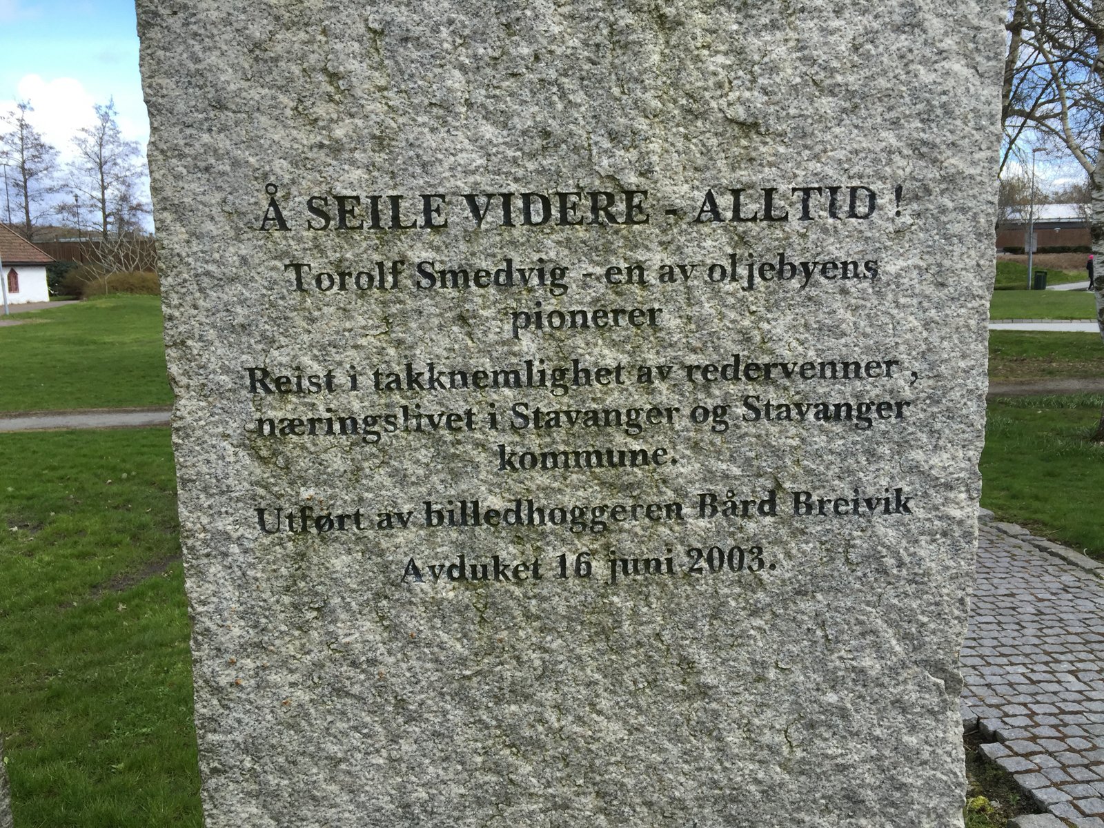«Å seile videre – alltid! Torolf Smedvig – en av oljebyens pionerer. Reist i takknemlighet av redervenner, næringslivet i Stavanger og Stavanger kommune.»