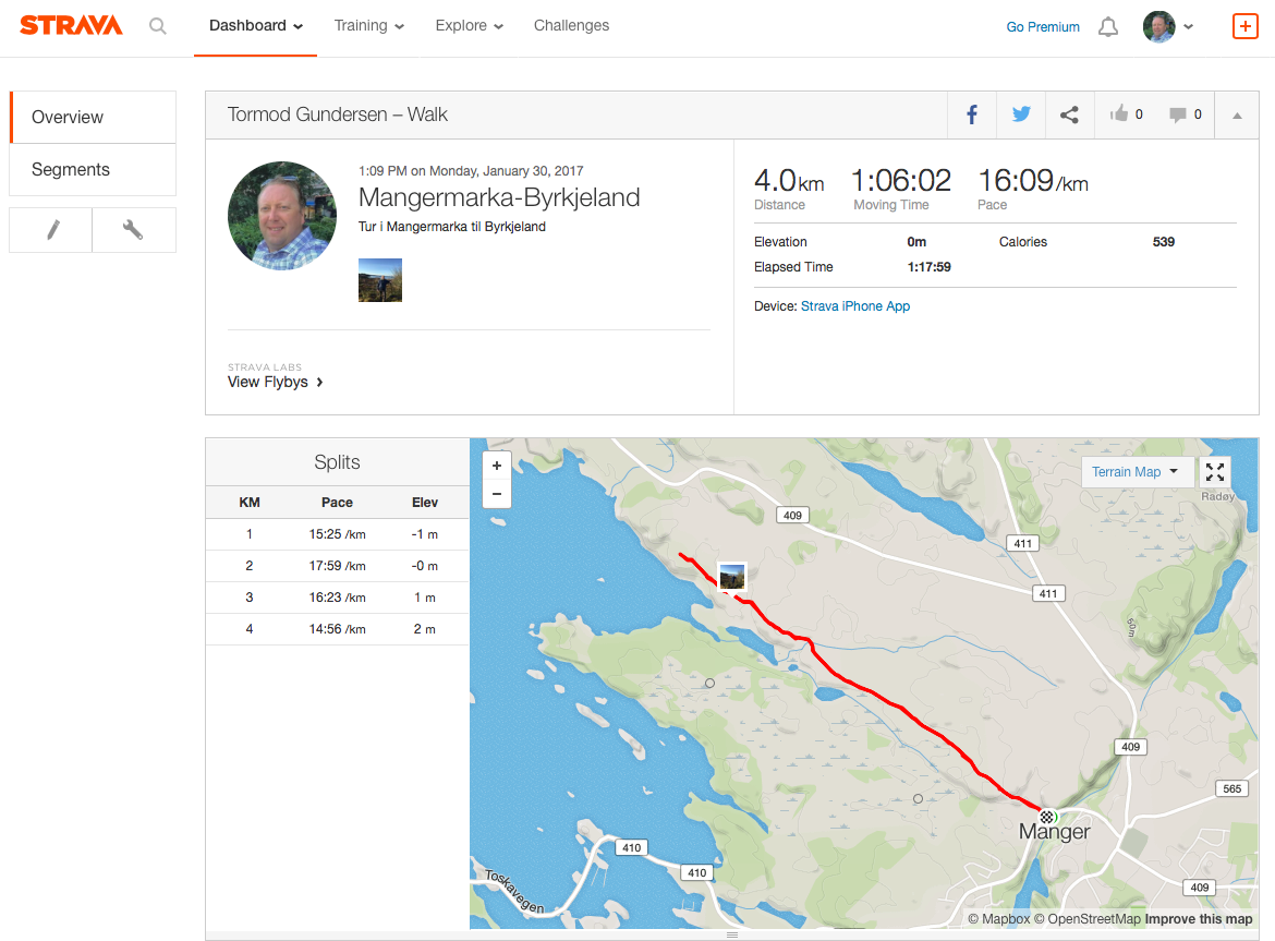 Kart i Strava treningsapp som viser tur til Byrkjeland gjennom Mangermarka.