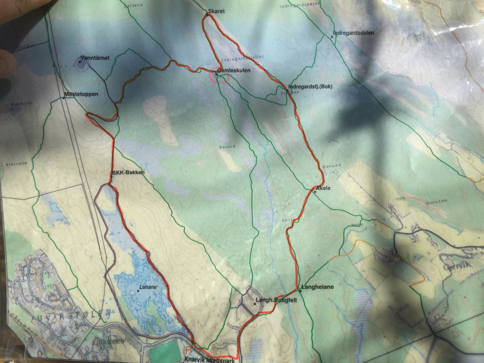 Kart over område og hvor rød markering viser turløypen vi gikk. Foto: Tormod Gundersen.