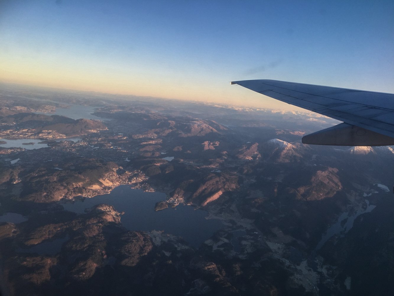 Flyreise Bergen – Oslo er en vakker flyreise over fjorder og fjell. Flyturen ble en vakker opplevelse, spesielt da været var så fint og man kunne se så langt øyet rekker. På turen satt jeg ved vinduet og ble virkelig imponert av de nydelige fargene på himmelen. Det er i slikt vær man misunner pilotene, men det er en god trøst at vi som passasjerer også kan oppleve alt gjennom sidevinduet. Her er noen av bildene jeg tok fra turen.